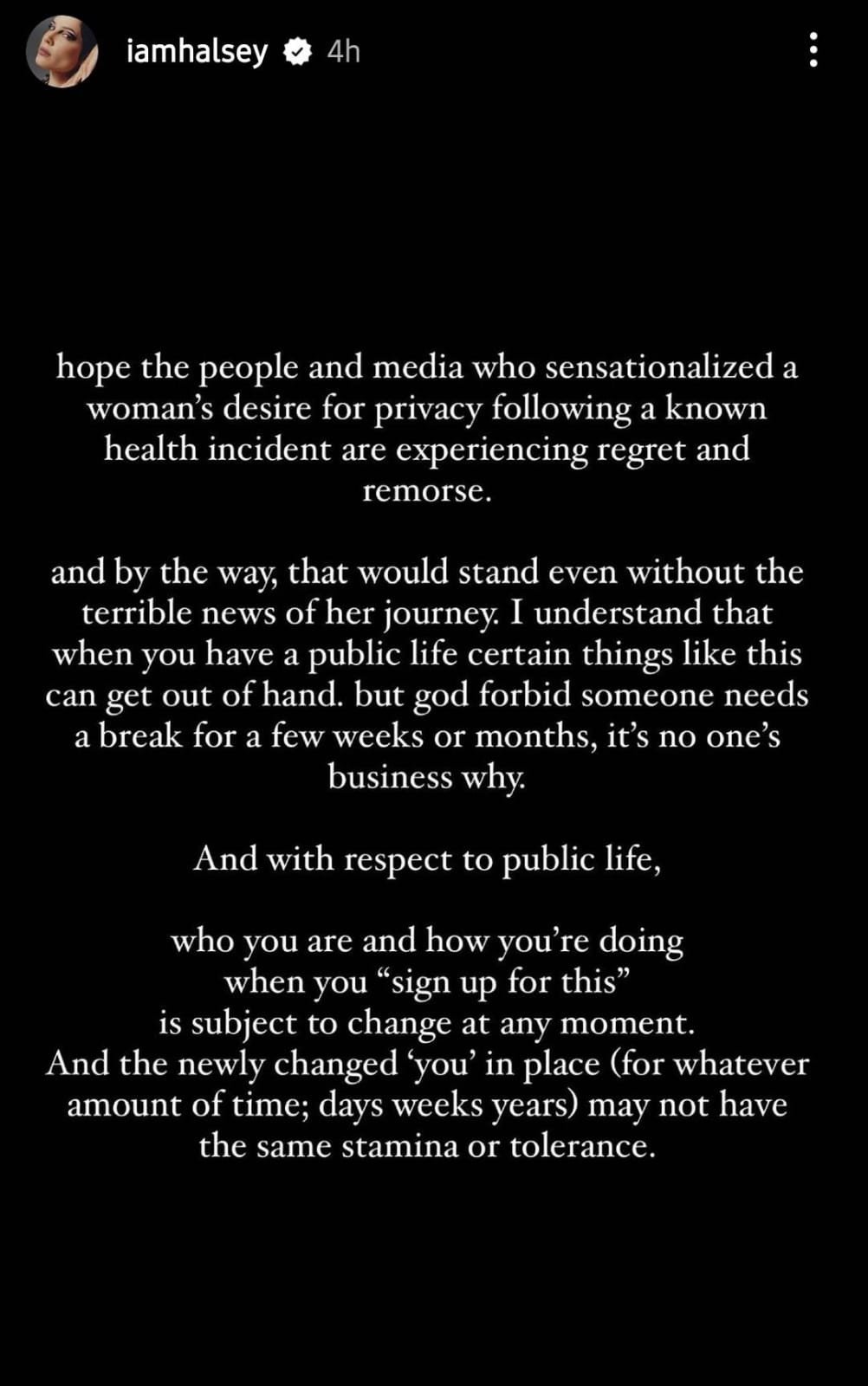 American singer and songwriter Halsey, too, took to her IG Stories to pen a note regarding the ordeal. “Hope the people and media who sensationalized a woman’s desire for privacy following a known health incident are experiencing regret and remorse,” stated the musician scathingly. She continued, “And by the way, that would stand even without the terrible news of her journey.”
