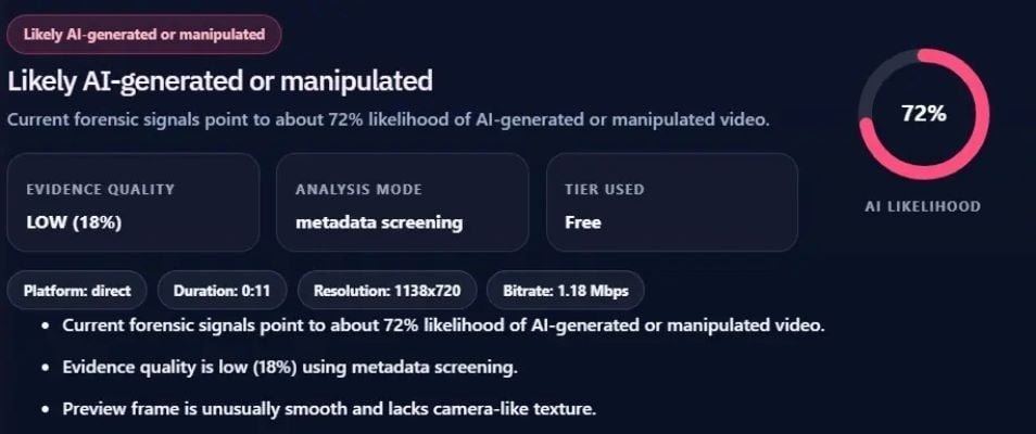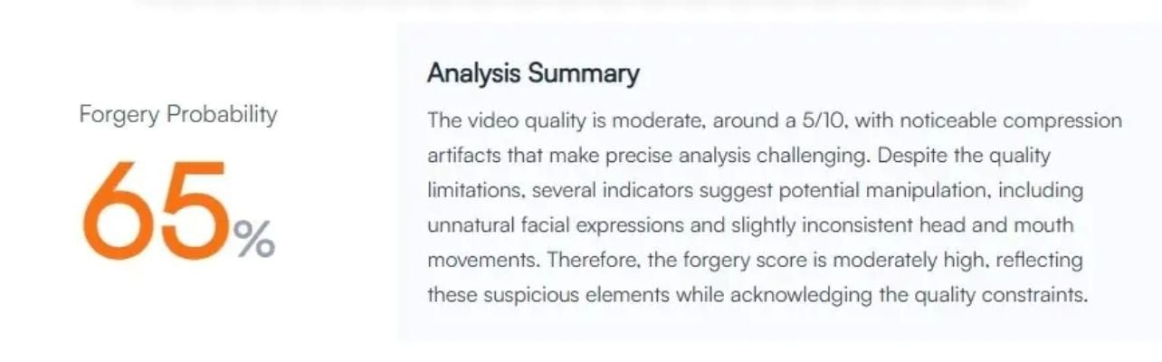 Running the video through AI-detection tools further revealed that Detect Video AI flagged it as being 72 per cent AI-generated. Similarly, Undetectable AI assigned it a 65pc forgery probability, noting that the clip contained “suspicious elements”.